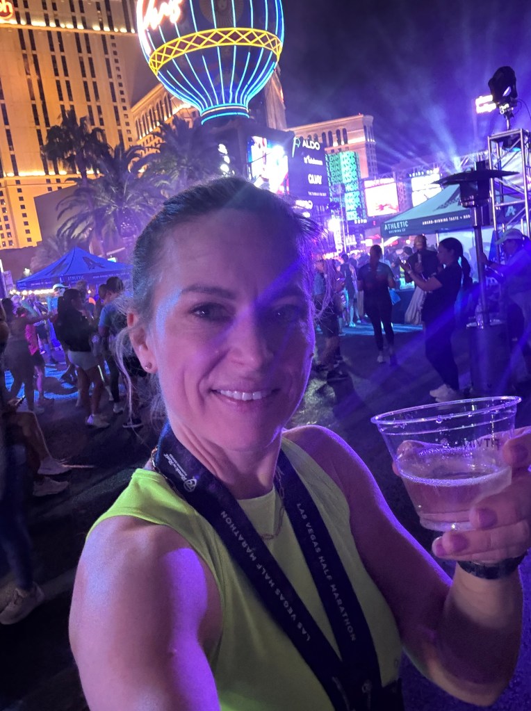Crossing that finish line is always electric and emotional. I always think about my two kids and imagine them at the finish line (no I don’t bring them to Vegas with me) which puts a big smile on my face. I felt euphoric while my endorphins were erasing any memory of struggle. The medal they placed around my neck shimmered with Vegas glitz—and hard-earned pride. I did it. Thirteen point one miles of determination, joy, and unforgettable sights. I cheered with glass of bubbles with other runners and walk thru the best finish line that resembles more of a club with disco balls and a dance floor.